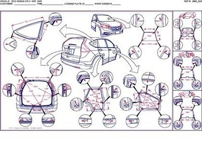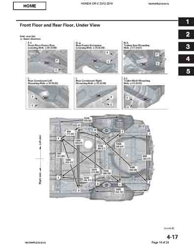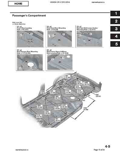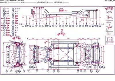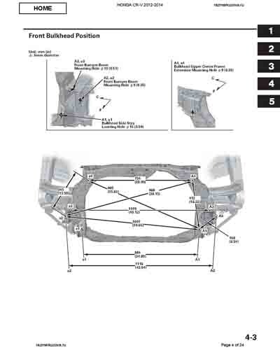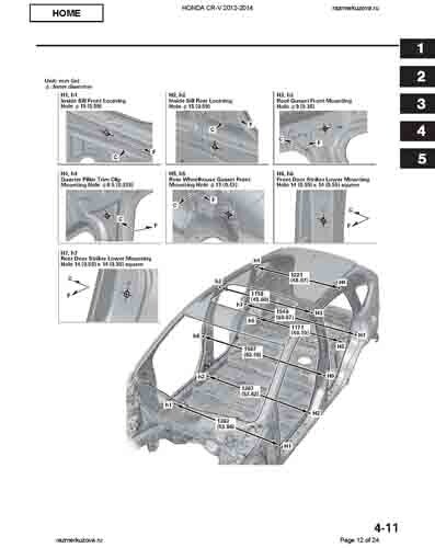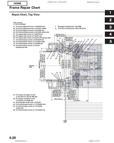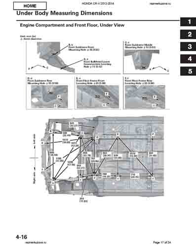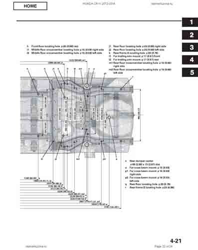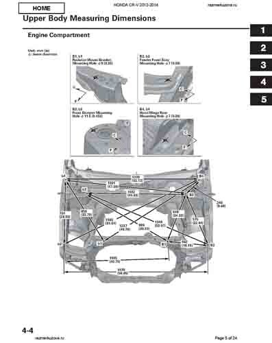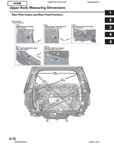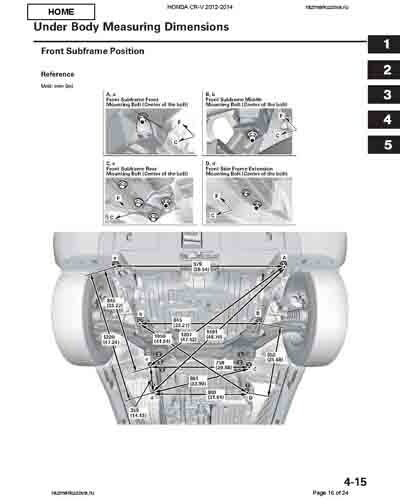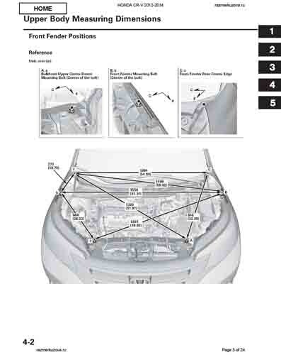 Контрольные кузовные размеры HONDA CR-V (RM) 2011-2018 из официального руководства по ремонту кузова. Содержат размеры верхней и нижней части кузова, в том числе размеры моторного отсека, диагональные размеры проемов кузова, размеры подрамников и контрольные точки для восстановления геометрии кузова. Даны значения допустимых зазоров кузовных панелей.