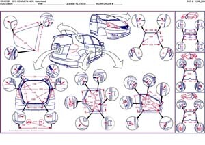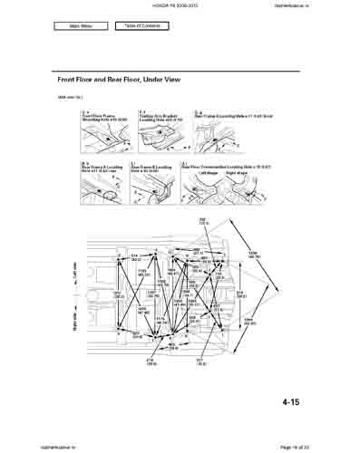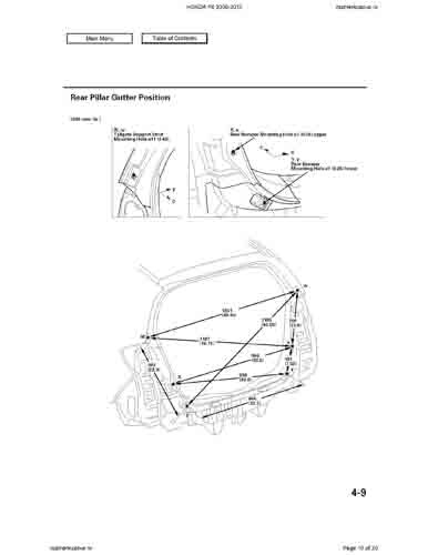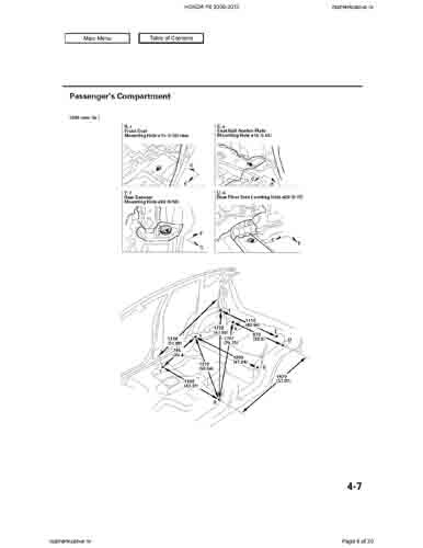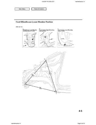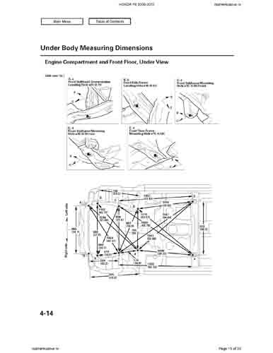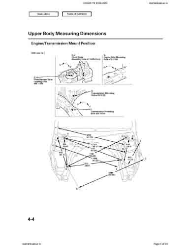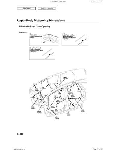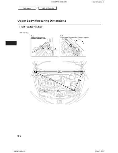 Контрольные кузовные размеры HONDA Fit 2008-2013 из официального руководства по ремонту кузова. Содержат размеры верхней и нижней части кузова, в том числе размеры моторного отсека, диагональные размеры проемов кузова, размеры подрамников и контрольные точки для восстановления геометрии кузова. Даны значения допустимых зазоров кузовных панелей.