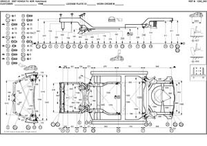 Контрольные кузовные размеры HONDA Fit 2013-2020 из официального руководства по ремонту кузова. Содержат размеры верхней и нижней части кузова, в том числе размеры моторного отсека, диагональные размеры проемов кузова, размеры подрамников и контрольные точки для восстановления геометрии кузова. Даны значения допустимых зазоров кузовных панелей.