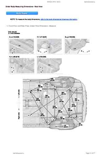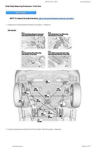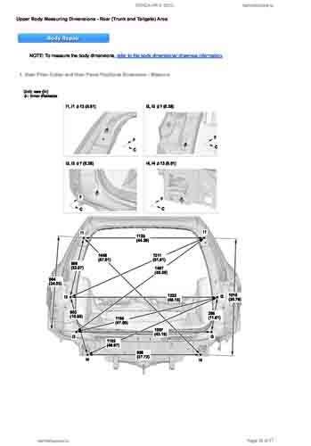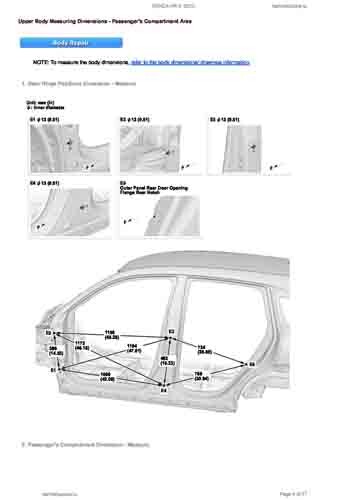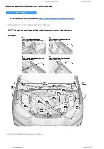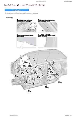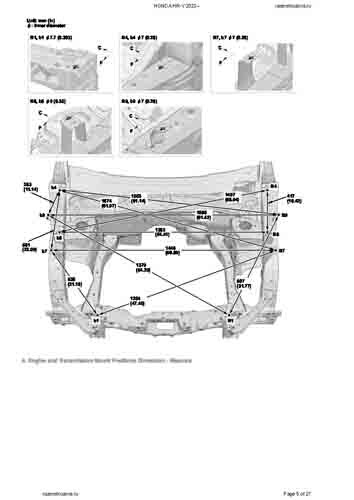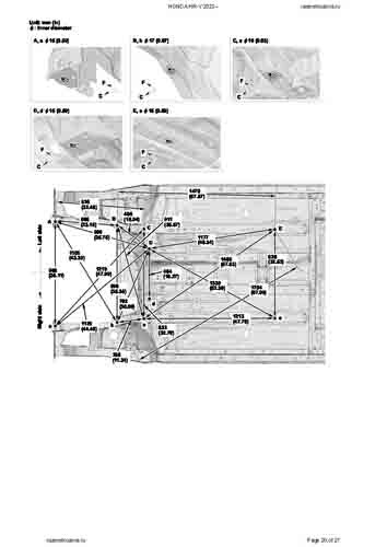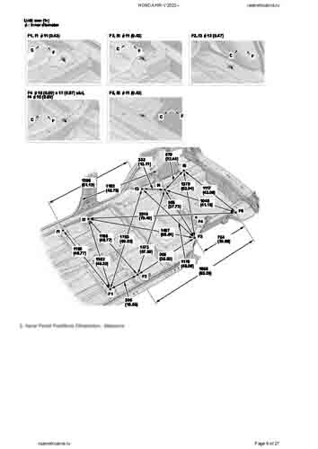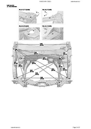 Контрольные кузовные размеры HONDA HR-V 2022-- из официального руководства по ремонту кузова. Содержат размеры верхней и нижней части кузова, в том числе размеры моторного отсека, диагональные размеры проемов кузова, размеры подрамников и контрольные точки для восстановления геометрии кузова. Даны значения допустимых зазоров кузовных панелей.