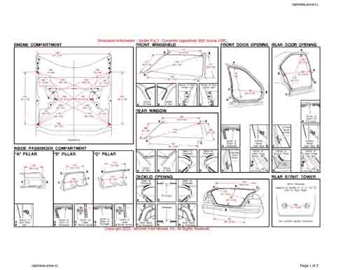- Геометрические размеры кузова Acura 3.5 RL, как проекционные, так и непосредственного измерения, в том числе диагональные размеры проемов кузова и контрольные точки для восстановления геометрии кузова.