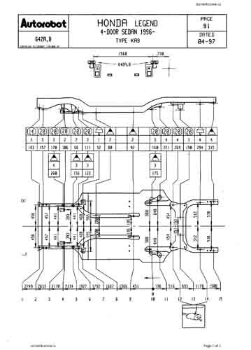 - Проекционные размеры HONDA Legend с привязкой к стапелю. Дополнительно приведены цветные фотографии мест расположения контрольных точек на реальном автомобиле.