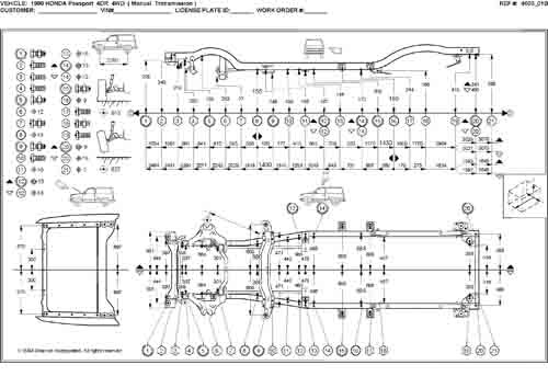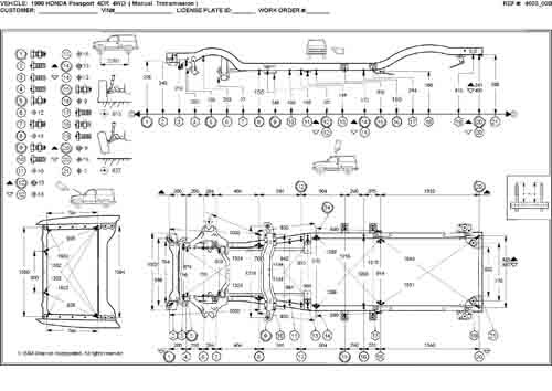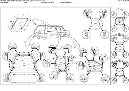 - Геометрические размеры кузова HONDA Passport 1993-1997, как проекционные, так и непосредственного измерения, в том числе диагональные размеры проемов кузова и контрольные точки для восстановления геометрии кузова.