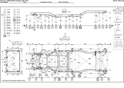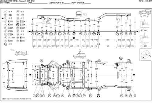 - Геометрические размеры кузова HONDA Passport 1997-2002, как проекционные, так и непосредственного измерения, в том числе диагональные размеры проемов кузова и контрольные точки для восстановления геометрии кузова.