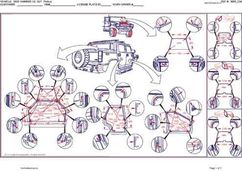 - Геометрические размеры кузова HUMMER H2 SUT 2005-2009, как проекционные, так и непосредственного измерения, в том числе диагональные размеры проемов кузова и контрольные точки для восстановления геометрии кузова.