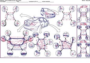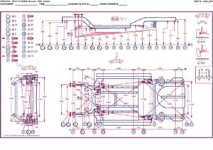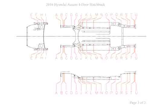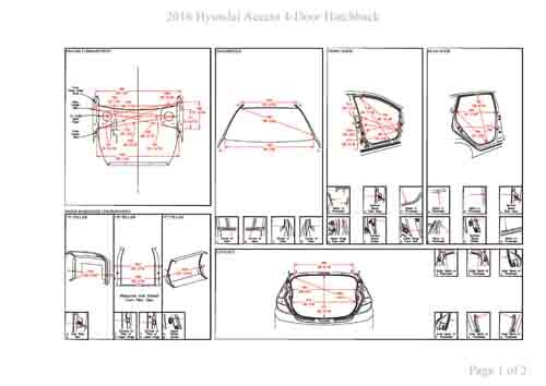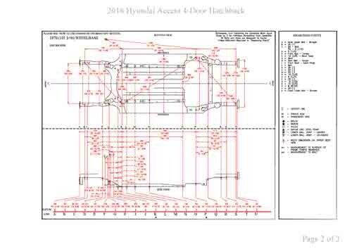 , как проекционные, так и непосредственного измерения, в том числе диагональные размеры проемов кузова и контрольные точки для восстановления геометрии кузова Хендай Акцент четвертого поколения.