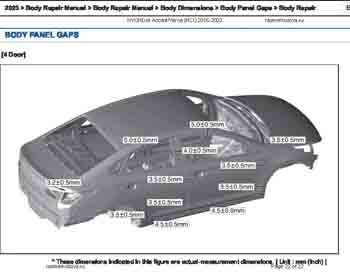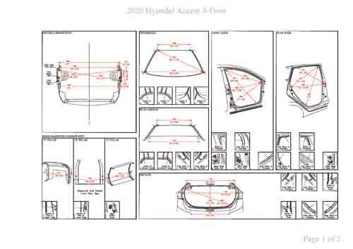 Контрольные размеры кузова для автомобилей HYUNDAI Accent, Verna (HC) 2017-2022 из заводского руководства по ремонту кузова, в том числе размеры проемов кузова. Дополнительно приведены сведения о допустимых зазорах кузовных панелей.