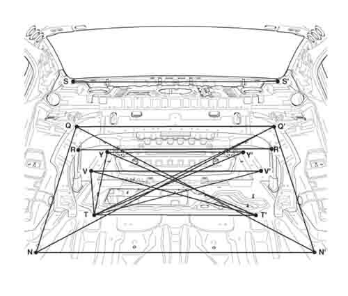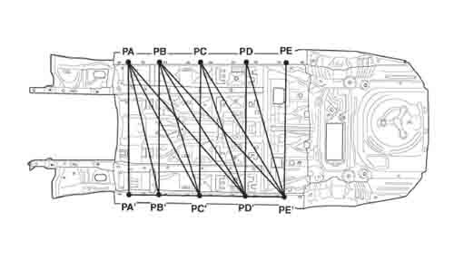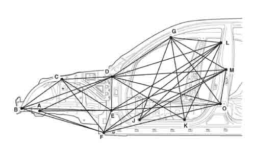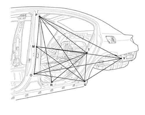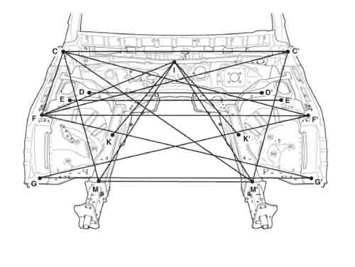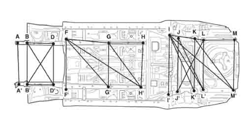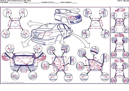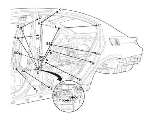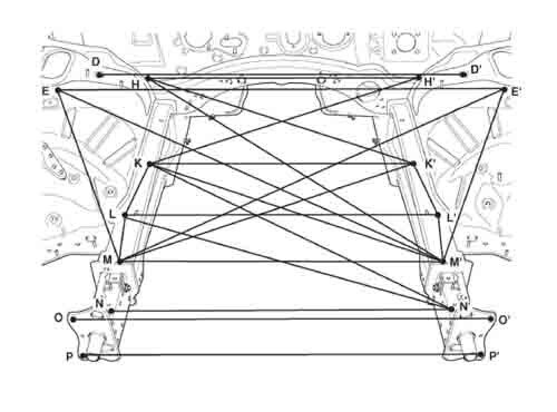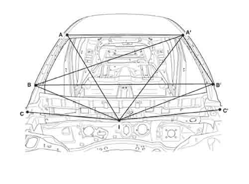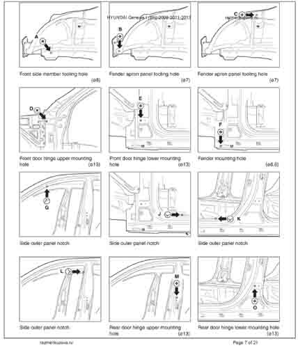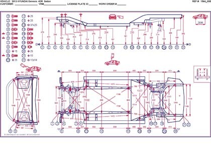 - Геометрические размеры кузова HYUNDAI Genesis 2008-2013, как проекционные, так и непосредственного измерения, в том числе диагональные размеры проемов кузова и контрольные точки для восстановления геометрии.