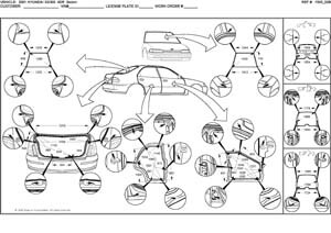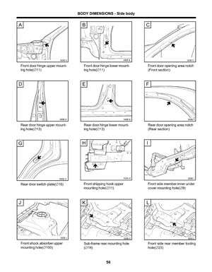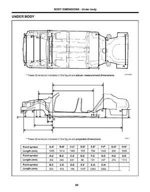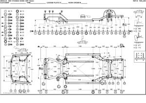 - Геометрические размеры кузова HYUNDAI XG300, как проекционные, так и непосредственного измерения, в том числе диагональные размеры проемов кузова и контрольные точки для восстановления геометрии.