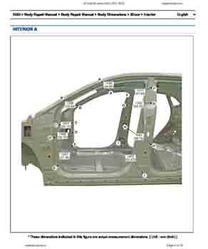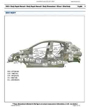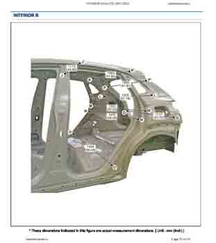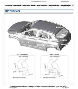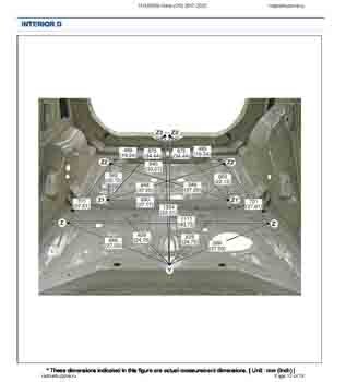 Контрольные размеры кузова для автомобилей HYUNDAI Kona (OS) 2017-2023 из заводского руководства по ремонту кузова, в том числе размеры проемов кузова. Дополнительно приведены сведения о допустимых зазорах кузовных панелей.