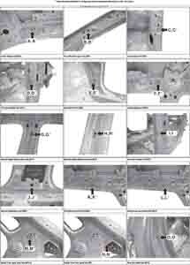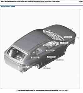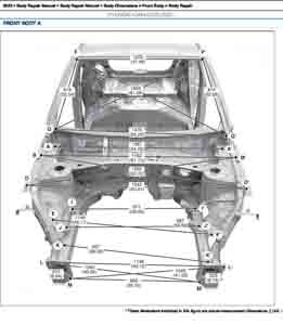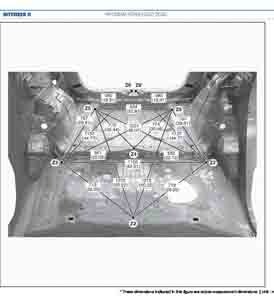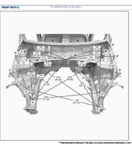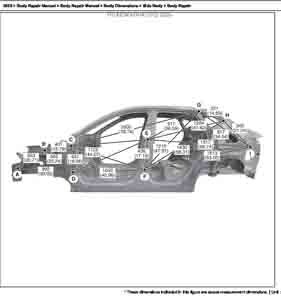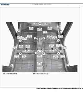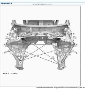 Контрольные размеры кузова для автомобилей HYUNDAI KONA (SX2) 2023-- из заводского руководства по ремонту кузова, в том числе размеры проемов кузова. Дополнительно приведены сведения о допустимых зазорах кузовных панелей.