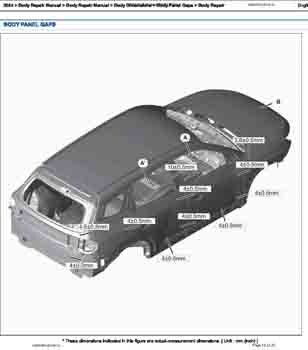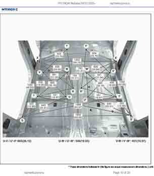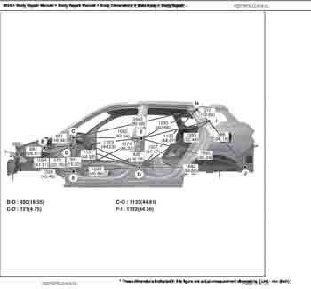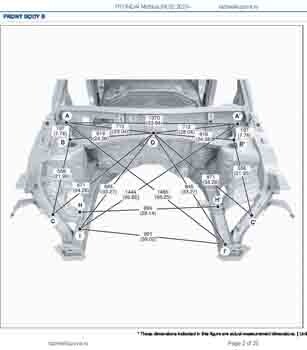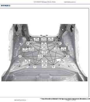 Контрольные размеры кузова для автомобилей HYUNDAI Mufasa (NU2) 2023-- из заводского руководства по ремонту кузова, в том числе размеры проемов кузова. Дополнительно приведены сведения о допустимых зазорах кузовных панелей.