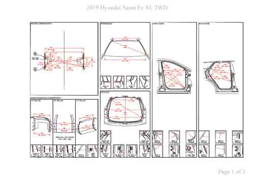 - Геометрические размеры кузова HYUNDAI Santa Fe XL для автомобилей североамериканского рынка, как проекционные, так и непосредственного измерения, в том числе диагональные размеры проемов кузова и контрольные точки для восстановления геометрии кузова.