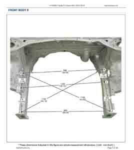 Контрольные размеры кузова для автомобилей HYUNDAI Santa Fe Grand (NC) 2013-2019 из заводского руководства по ремонту кузова, в том числе размеры проемов кузова. Дополнительно приведены сведения о допустимых зазорах кузовных панелей. В Южной Корее автомобиль продавался под наименованием HYUNDAI Maxcruz
