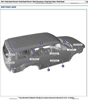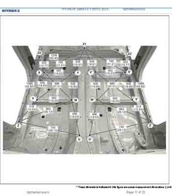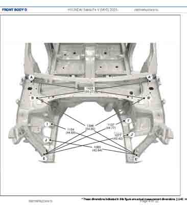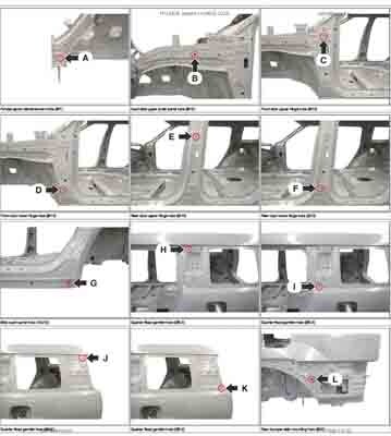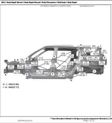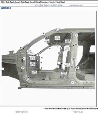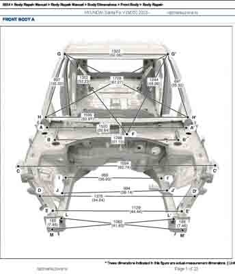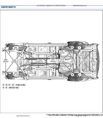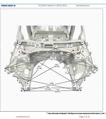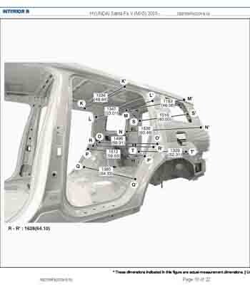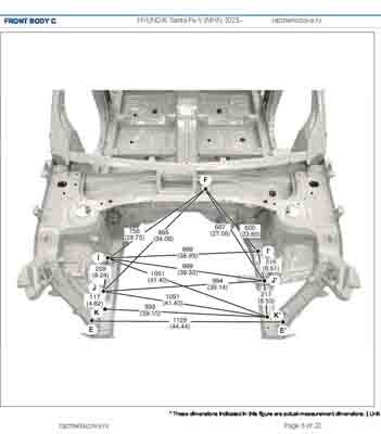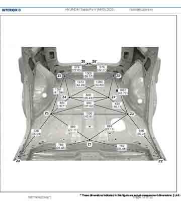 Контрольные размеры кузова для автомобилей HYUNDAI Santa Fe V (MX5) 2023-- из заводского руководства по ремонту кузова, в том числе размеры проемов кузова и контрольные точки для восстановления геометрии кузова Хендай Санта Фэ, Хендэ Сантафе пятого поколения. Дополнительно приведены сведения о допустимых зазорах кузовных панелей.