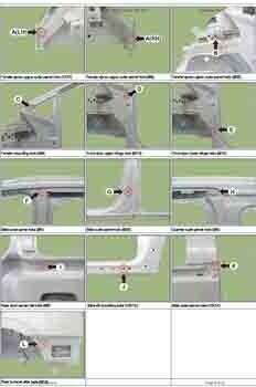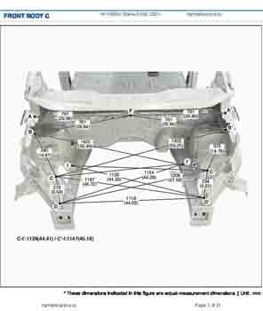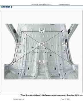 Контрольные размеры кузова для автомобилей HYUNDAI Staria (US4) 2021-- из заводского руководства по ремонту кузова, в том числе размеры проемов кузова. Дополнительно приведены сведения о допустимых зазорах кузовных панелей.