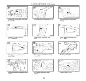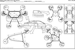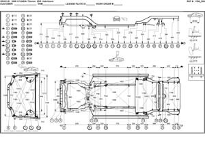 - Геометрические размеры кузова HYUNDAI Tiburon, как проекционные, так и непосредственного измерения, в том числе диагональные размеры проемов кузова и контрольные точки для восстановления геометрии.