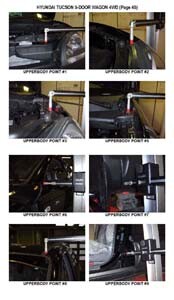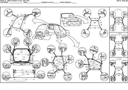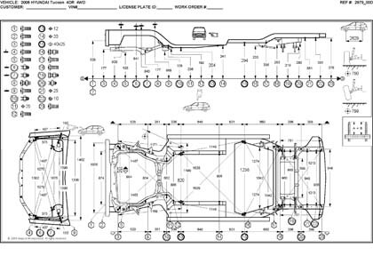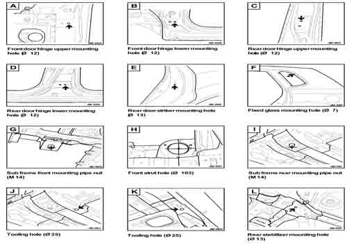 - Проекционные размеры с привязкой к стапелю. Дополнительно приведены цветные фотографии мест расположения контрольных точек на реальном автомобиле.