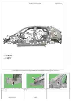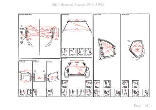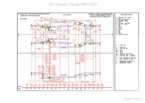 - Геометрические размеры кузова HYUNDAI Tucson (TL) 2015-2018, как проекционные, так и непосредственного измерения, в том числе диагональные размеры проемов кузова и контрольные точки для восстановления геометрии кузова.