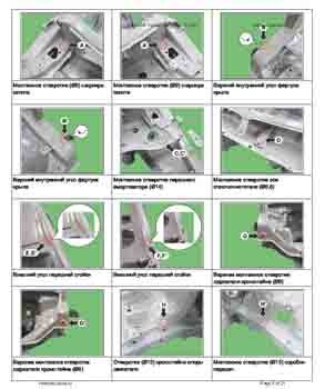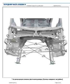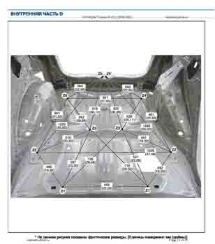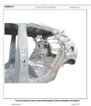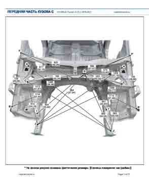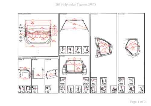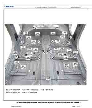 - Геометрические размеры кузова HYUNDAI Tucson (TL) 2019-2020, как проекционные, так и непосредственного измерения, в том числе диагональные размеры проемов кузова и контрольные точки для восстановления геометрии кузова.