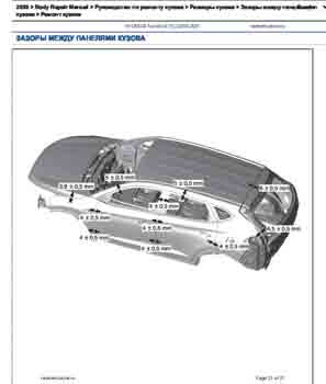 Контрольные размеры кузова для автомобилей HYUNDAI Tucson III (TL) 2018-2021 из заводского руководства по ремонту кузова, в том числе размеры проемов кузова. Дополнительно приведены сведения о допустимых зазорах кузовных панелей.