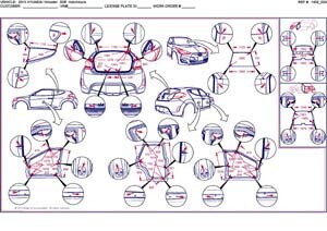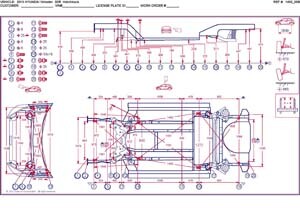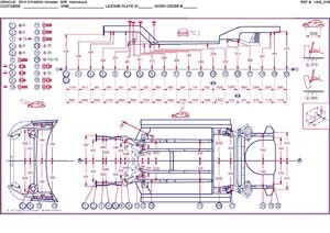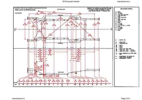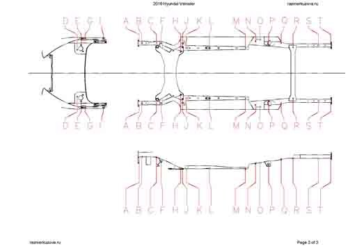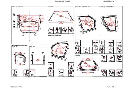 - Геометрические размеры кузова HYUNDAI Veloster, как проекционные, так и непосредственного измерения, в том числе диагональные размеры проемов кузова и контрольные точки для восстановления геометрии.