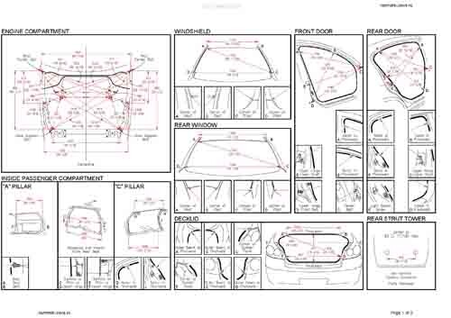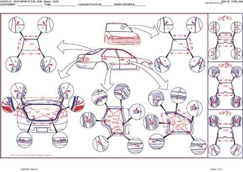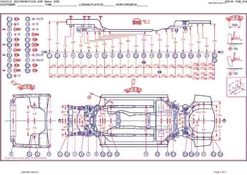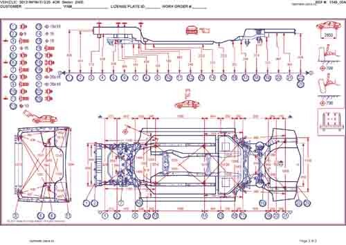 - Геометрические размеры кузова INFINITI G25 2006-2013, как проекционные, так и непосредственного измерения, в том числе диагональные размеры проемов кузова и контрольные точки для восстановления геометрии кузова.