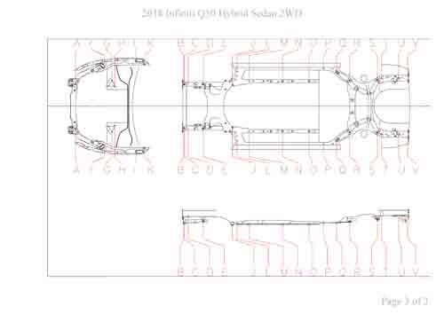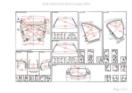 - Геометрические размеры кузова INFINITI Q50 (V37) Hybrid 2014-2018, как проекционные, так и непосредственного измерения, в том числе диагональные размеры проемов кузова и контрольные точки для восстановления геометрии кузова.