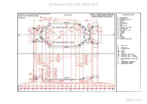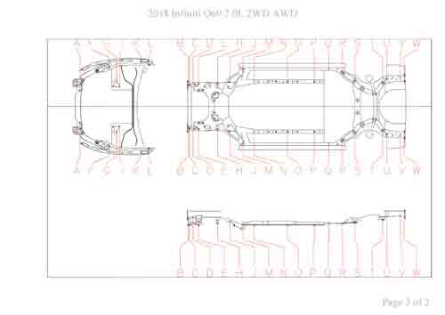 - Геометрические размеры кузова INFINITI Q60 (CV37) 2017-2022, как проекционные, так и непосредственного измерения, в том числе диагональные размеры проемов кузова и контрольные точки для восстановления геометрии кузова.