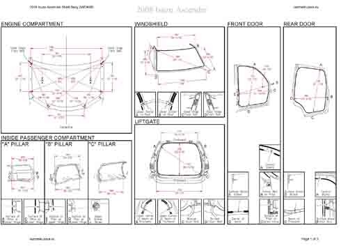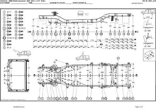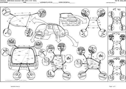 - Геометрические размеры кузова ISUZU Ascender 2003-2008, как проекционные, так и непосредственного измерения, в том числе диагональные размеры проемов кузова и контрольные точки для восстановления геометрии кузова.
