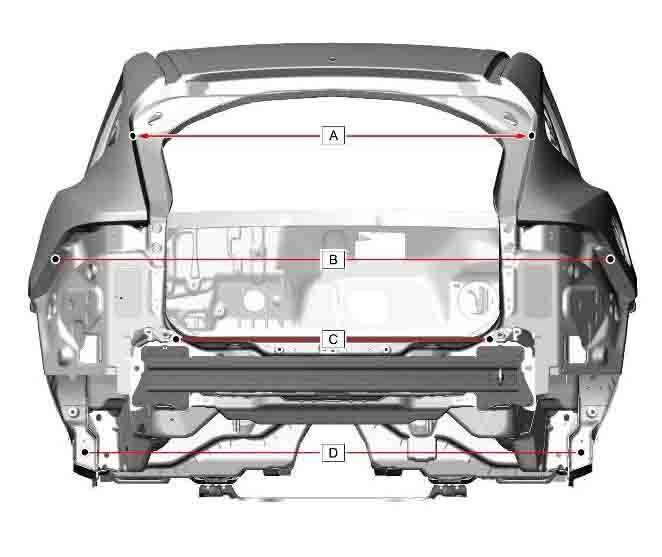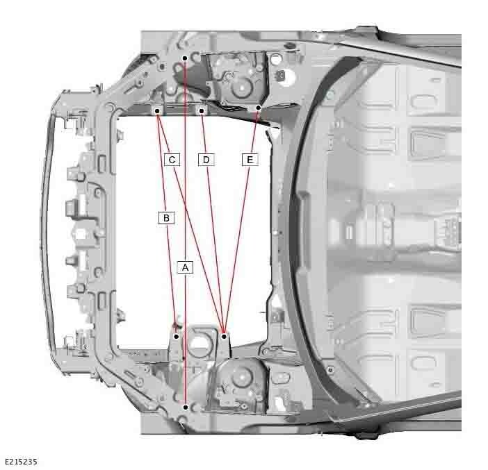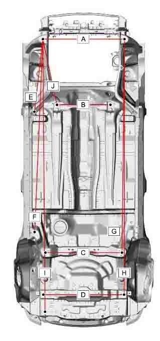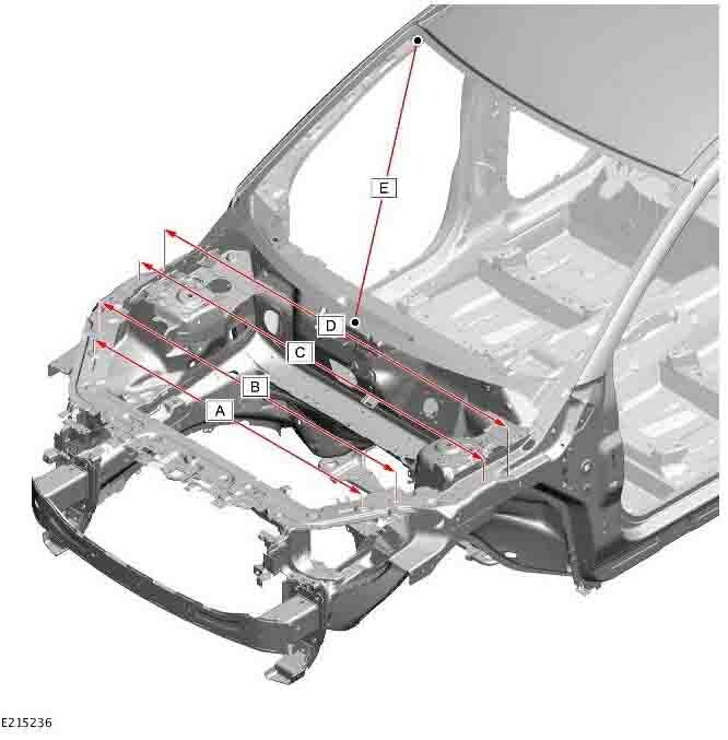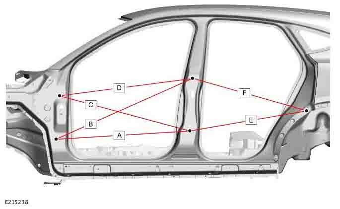Контрольные кузовные размеры JAGUAR E-Pace (X540) 2017-2021-2024 из официального руководства по ремонту кузова. В том числе диагональные размеры проемов кузова и контрольные точки для восстановления геометрии кузова. Дополнительно приведены допустимые значения зазоров кузовных панелей.