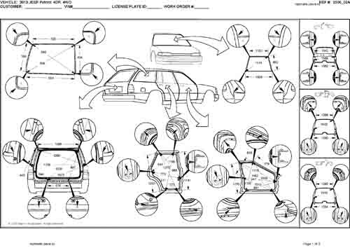 - Геометрические размеры кузова JEEP Patriot (MK) 2010-2017, как проекционные, так и непосредственного измерения, в том числе диагональные размеры проемов кузова и контрольные точки для восстановления геометрии кузова.