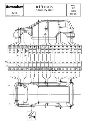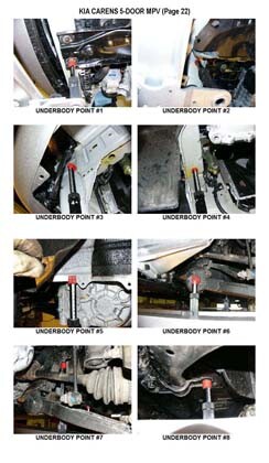 - Проекционные геометрические размеры кузова Kia Carens с привязкой к стапелю. Дополнительно приведены цветные фотографии мест расположения контрольных точек на реальном автомобиле.
