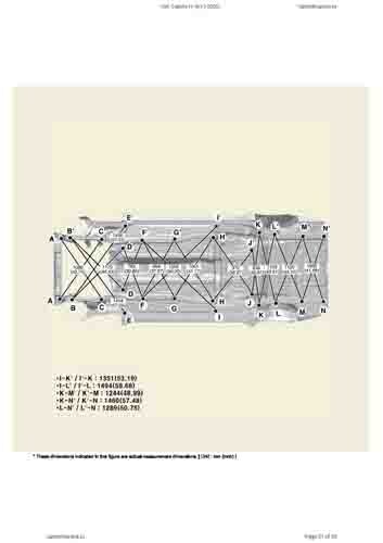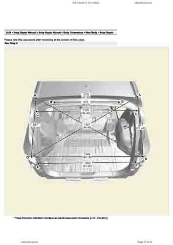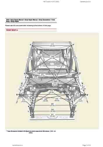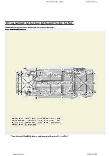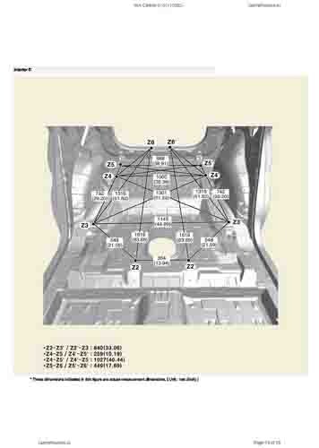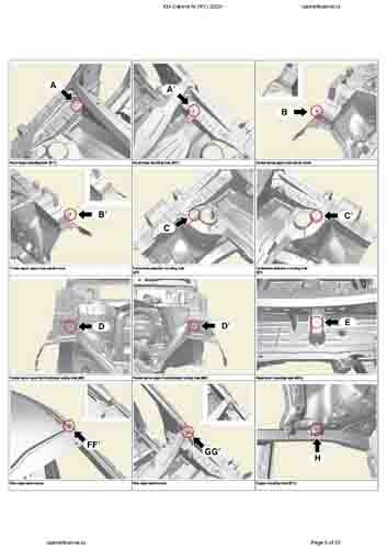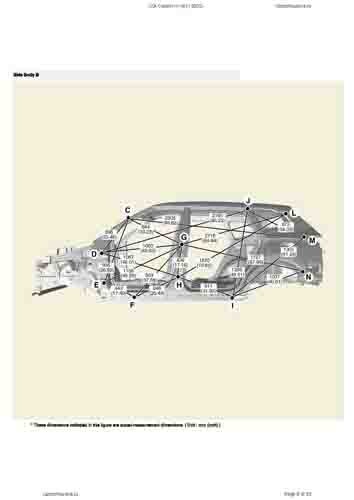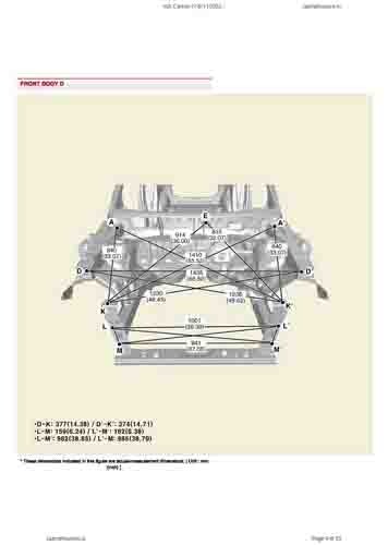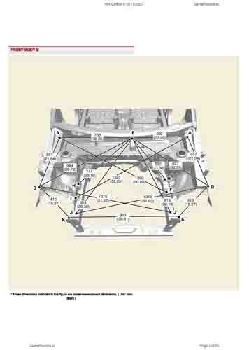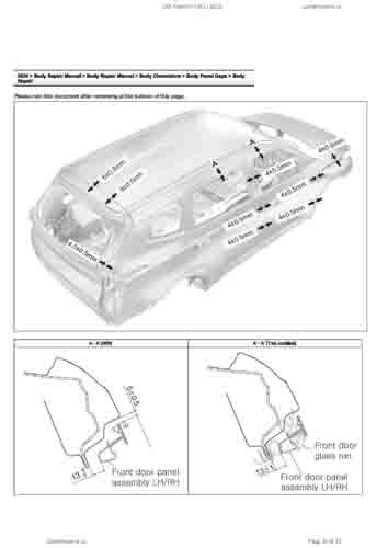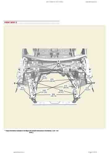 Контрольные кузовные размеры из официального руководства по ремонту кузова KIA Carens IV (KY) 2022--, в том числе диагональные размеры проемов кузова и контрольные точки для восстановления геометрии. Дополнительно приведены допустимые значения зазоров кузовных панелей.