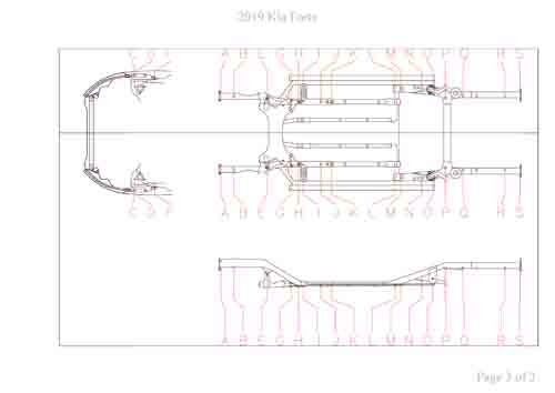 - Геометрические размеры кузова KIA Forte (BD) 2018--, как проекционные, так и непосредственного измерения, в том числе диагональные размеры проемов кузова и контрольные точки для восстановления геометрии кузова.