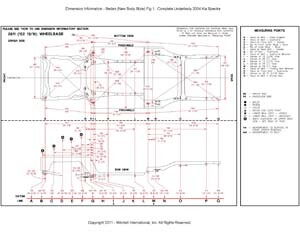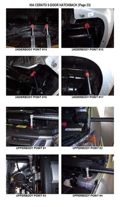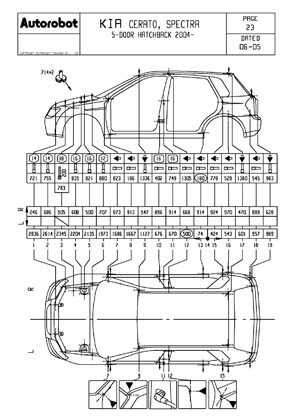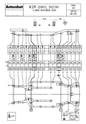 - Проекционные геометрические размеры кузова с привязкой к стапелю. Дополнительно приведены цветные фотографии мест расположения контрольных точек KIA Cerato на реальном автомобиле.