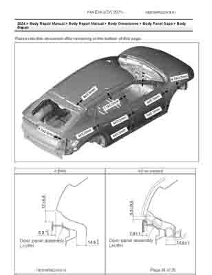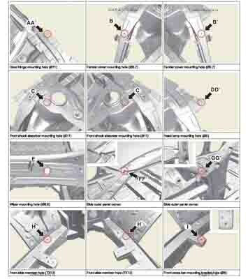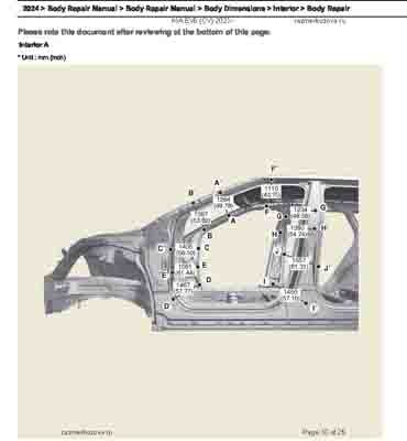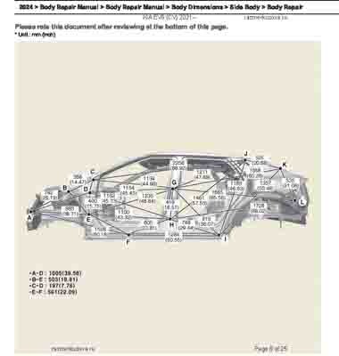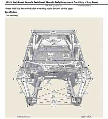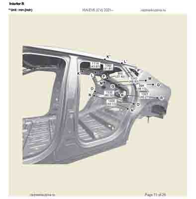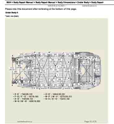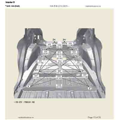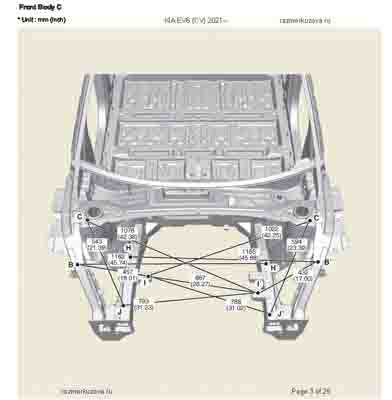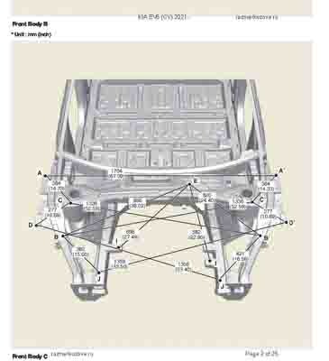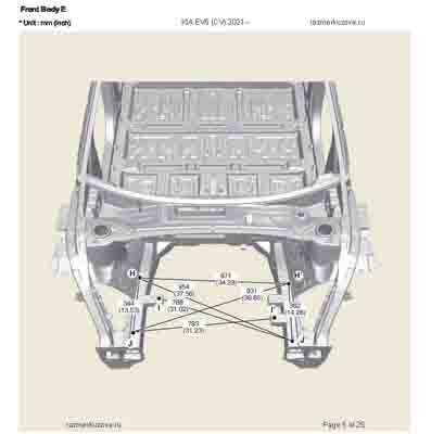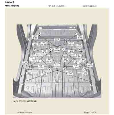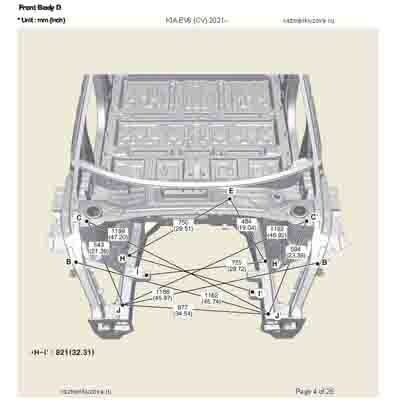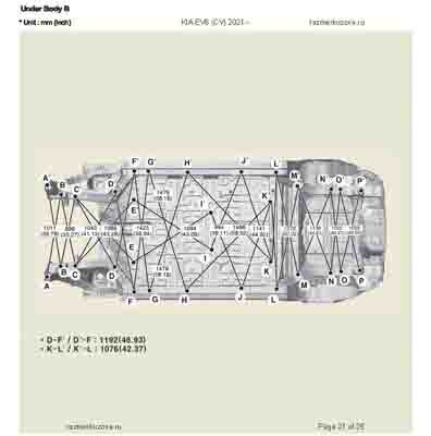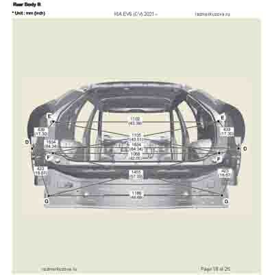 Контрольные кузовные размеры из официального руководства по ремонту кузова KIA EV6 (CV) 2021--, в том числе диагональные размеры проемов кузова и контрольные точки для восстановления геометрии. Дополнительно приведены допустимые значения зазоров кузовных панелей.