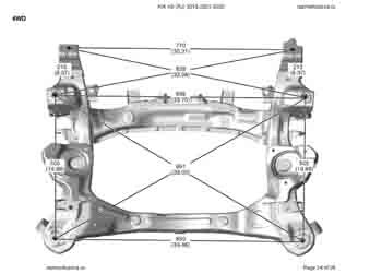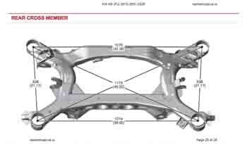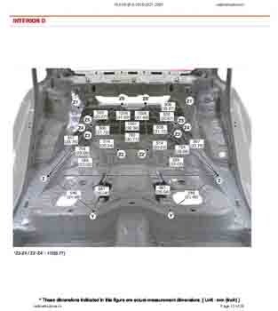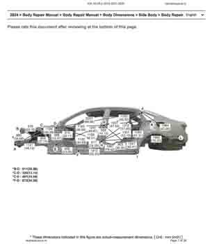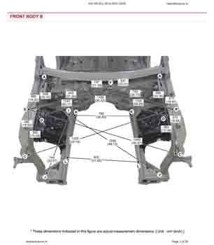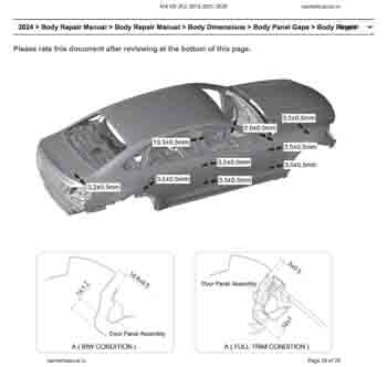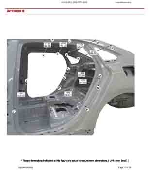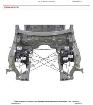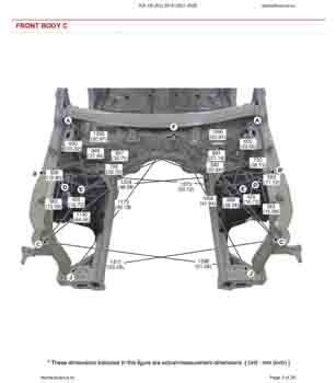 Контрольные кузовные размеры из заводского руководства по ремонту кузова KIA K9 (RJ) 2018-2021-2025, в том числе диагональные размеры проемов кузова и контрольные точки для восстановления геометрии. Дополнительно приведены допустимые значения зазоров кузовных панелей. На рынке США и Канады модель представлена под названием Kia K900