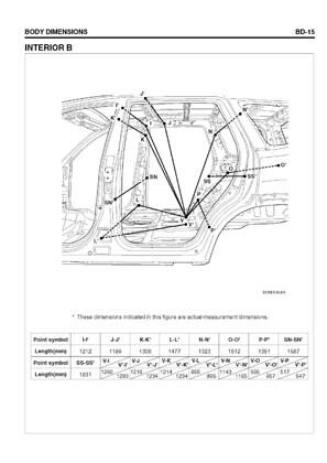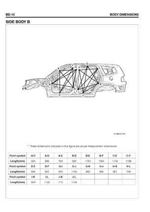 - Геометрические размеры кузова KIA Borrego, как проекционные, так и непосредственного измерения, в том числе диагональные размеры проемов кузова и контрольные точки для восстановления геометрии кузова.