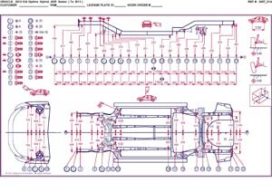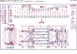 - Геометрические размеры кузова KIA Optima, как проекционные, так и непосредственного измерения, в том числе диагональные размеры проемов кузова и контрольные точки для восстановления геометрии кузова.