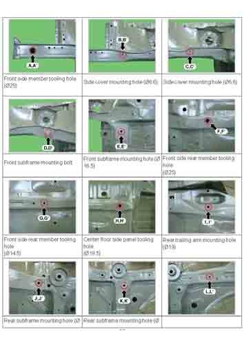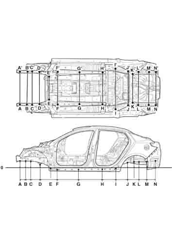 - Из заводского руководства по ремонту кузова Body Repair Manual, в том числе диагональные размеры проемов кузова и контрольные точки для восстановления геометрии.
