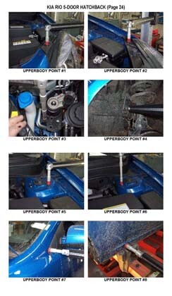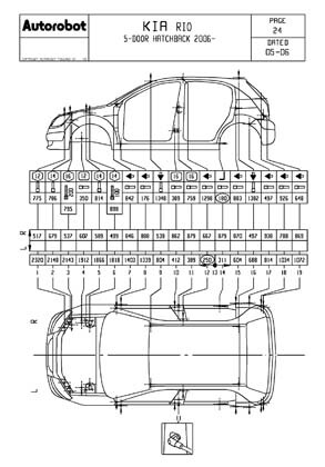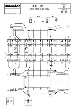- Проекционные геометрические размеры кузова с привязкой к стапелю. Дополнительно приведены цветные фотографии мест расположения контрольных точек KIA Rio на реальном автомобиле.