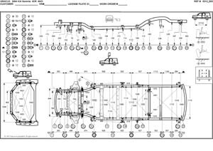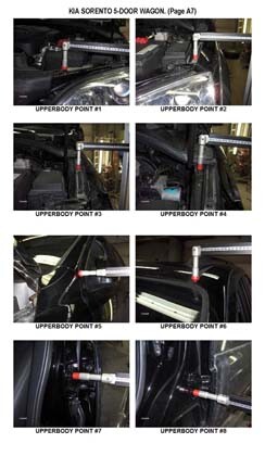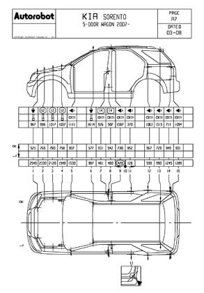 - Проекционные геометрические размеры кузова с привязкой к стапелю. Дополнительно приведены цветные фотографии мест расположения контрольных точек KIA Sorento на реальном автомобиле.