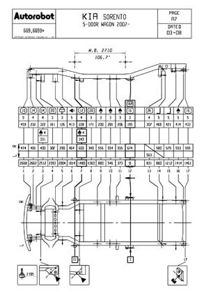 - Геометрические размеры кузова KIA Sorento, как проекционные, так и непосредственного измерения, в том числе диагональные размеры проемов кузова и контрольные точки для восстановления геометрии кузова Киа Соренто.