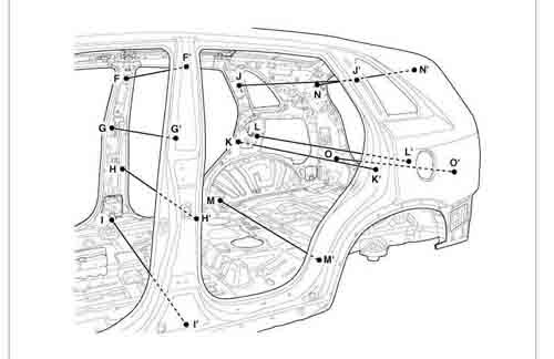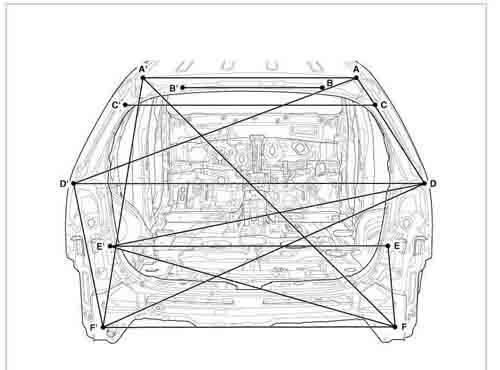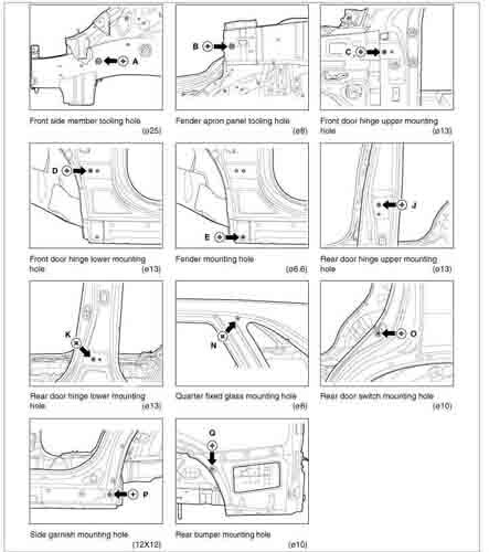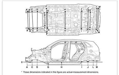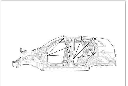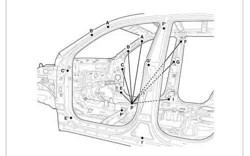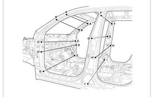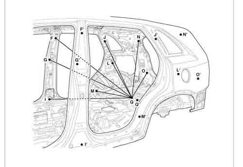 - Из заводского руководства по ремонту кузова KIA Sorento Body Repair Manual, в том числе диагональные размеры проемов кузова и контрольные точки для восстановления геометрии кузова Киа Соренто.