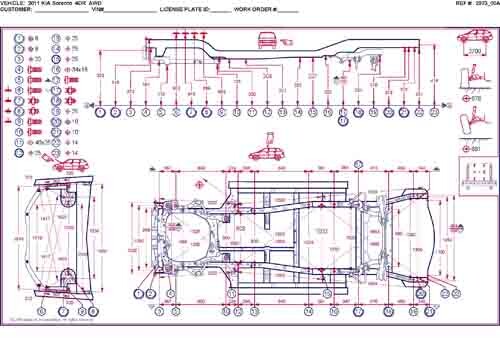 - Геометрические размеры кузова KIA Sorento, как проекционные, так и непосредственного измерения, в том числе диагональные размеры проемов кузова и контрольные точки для восстановления геометрии кузова Киа Соренто.