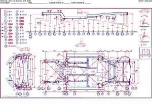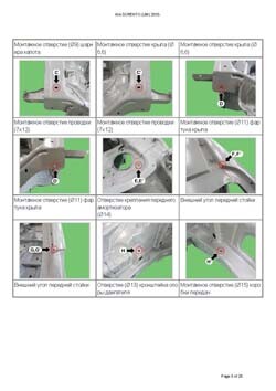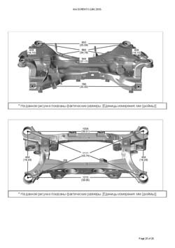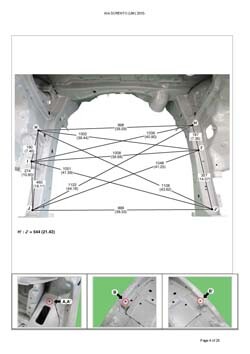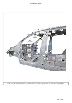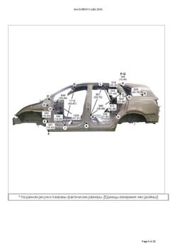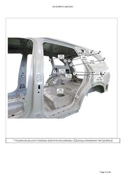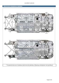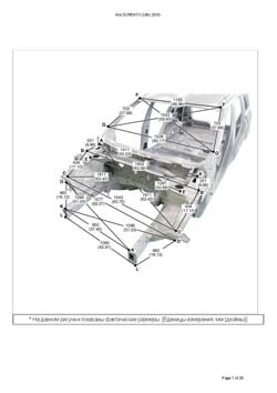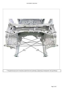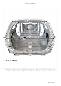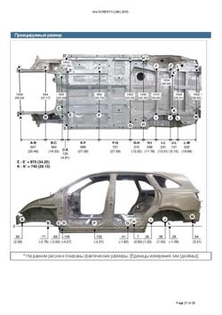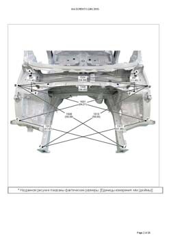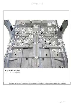 - Геометрические размеры кузова KIA Sorento (UM) 2014-2020, как проекционные, так и непосредственного измерения, в том числе диагональные размеры проемов кузова и контрольные точки для восстановления геометрии кузова.