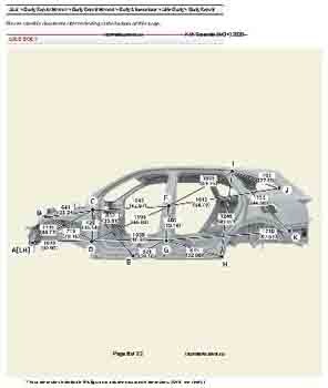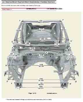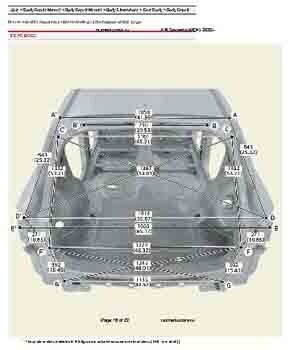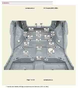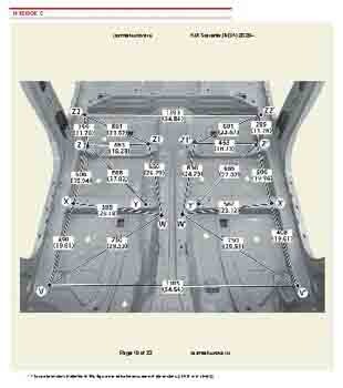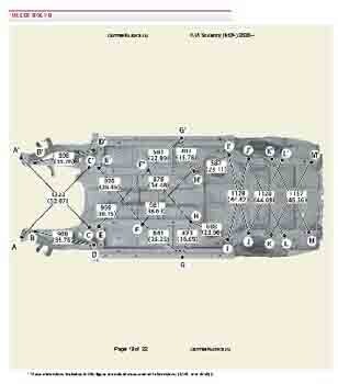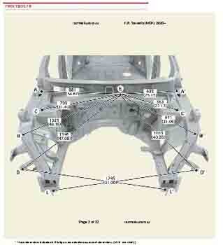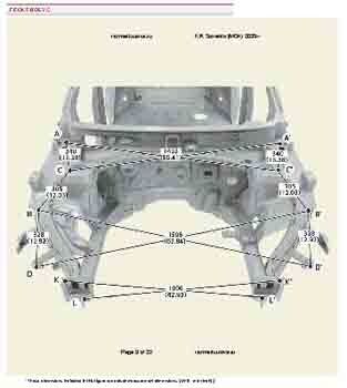 Контрольные кузовные размеры из заводского руководства по ремонту кузова KIA Sorento IV (MQ4) 2020--, в том числе диагональные размеры проемов кузова и контрольные точки для восстановления геометрии. Дополнительно приведены допустимые значения зазоров кузовных панелей.