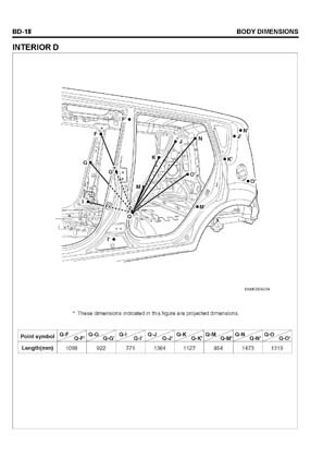 - Геометрические размеры кузова KIA Soul, как проекционные, так и непосредственного измерения, в том числе диагональные размеры проемов кузова и контрольные точки для восстановления геометрии кузова.