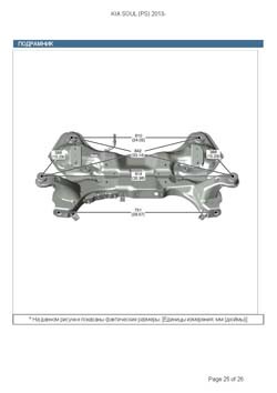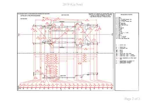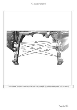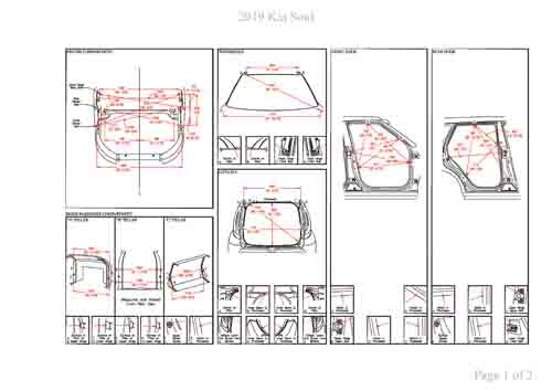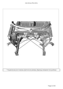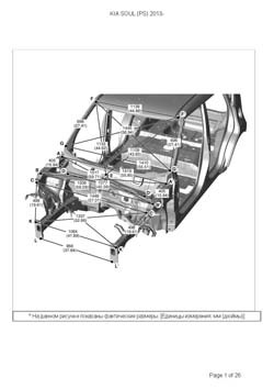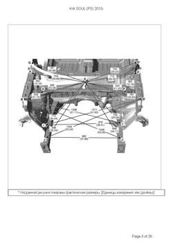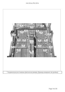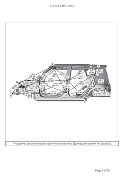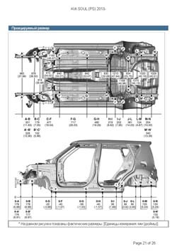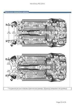 - Геометрические размеры кузова KIA Soul (PS) 2013-2019, как проекционные, так и непосредственного измерения, в том числе диагональные размеры проемов кузова и контрольные точки для восстановления геометрии кузова.